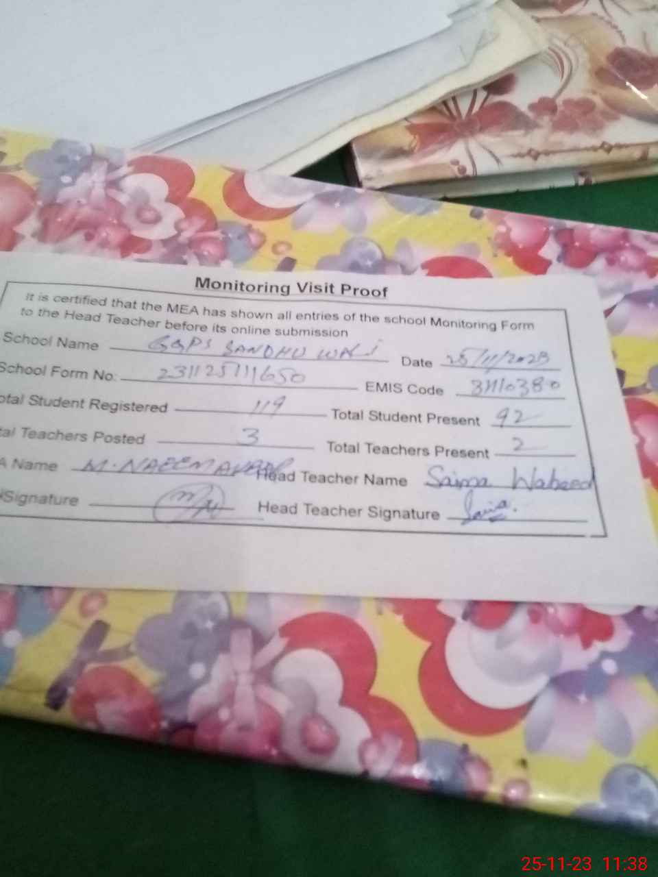 | Attendance Register | Head Teacher | MEA with School | Visit Proof |