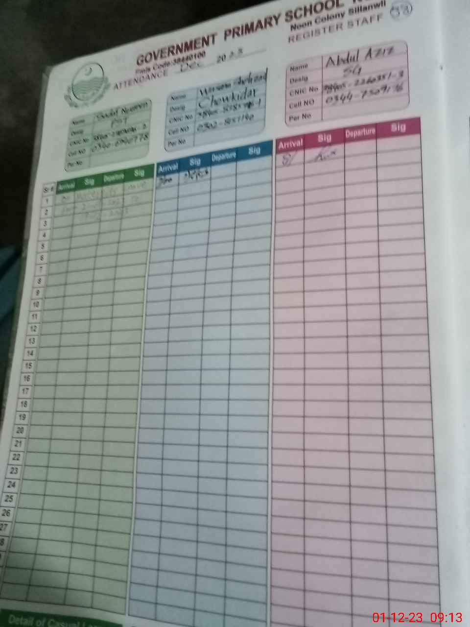 | CNIC | Full Name | Designation | R/C | Absence during last cal. month |