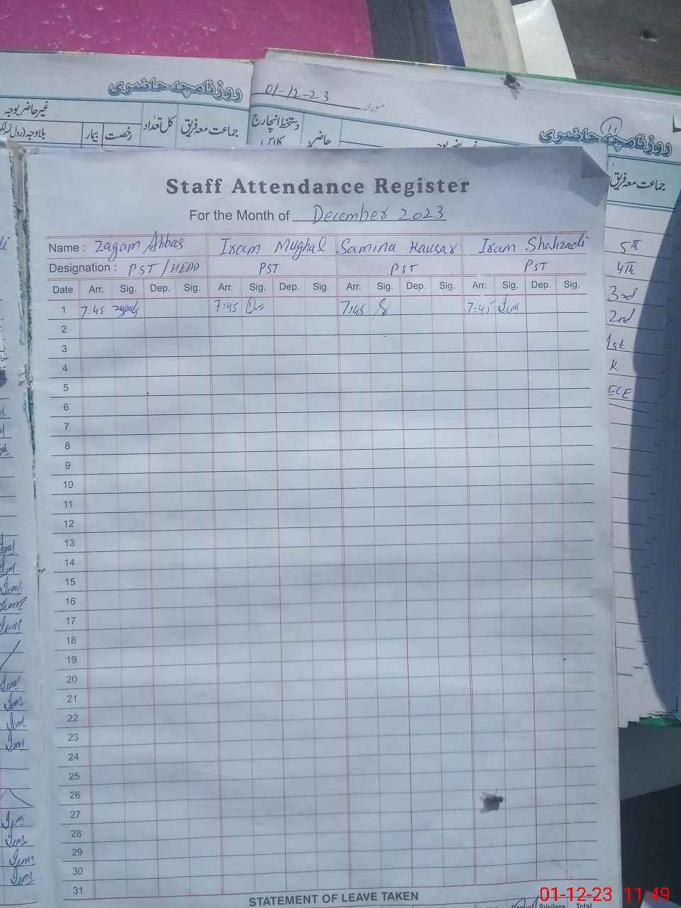| CNIC | Full Name | Designation | R/C | Absence During Last Calender Month |