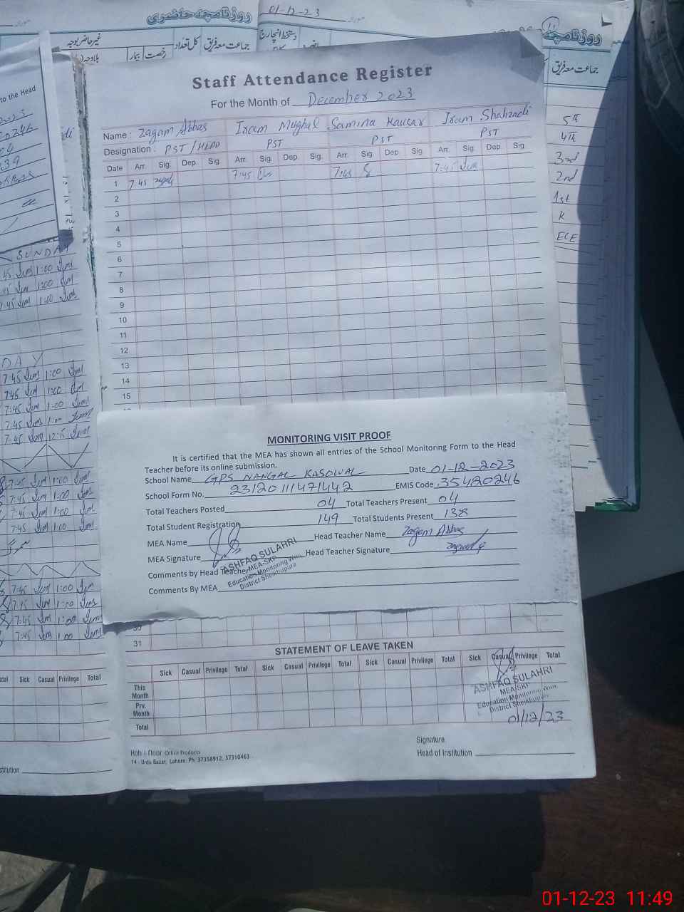 | Attendance Register | Head Teacher | MEA with School | Visit Proof |