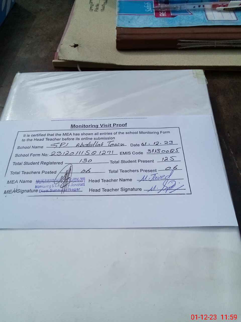 | Attendance Register | Head Teacher | MEA with School | Visit Proof |