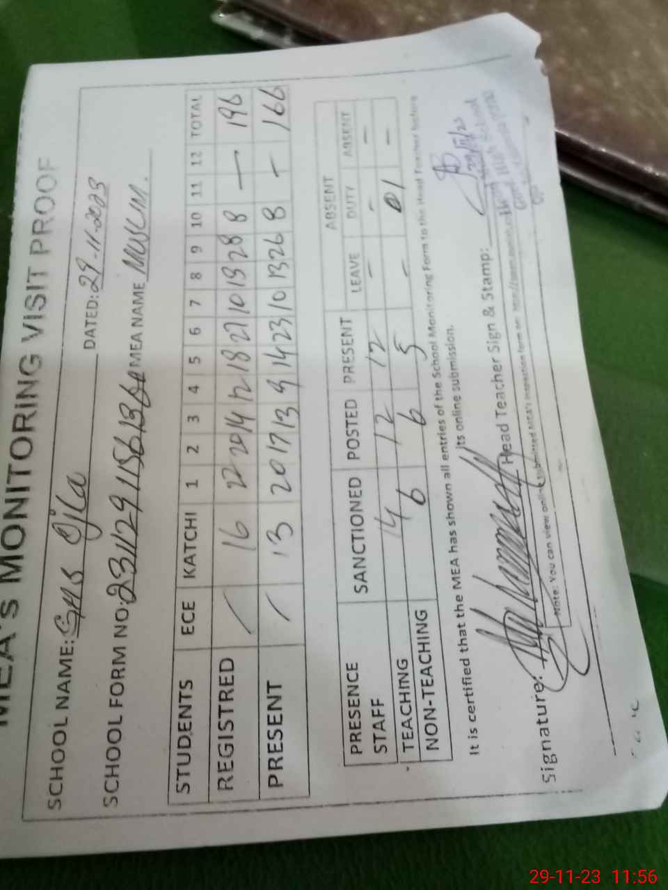| Attendance Register | Head Teacher | MEA with School | Visit Proof |