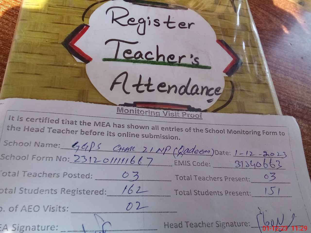 | Attendance Register | Head Teacher | MEA with School | Visit Proof |