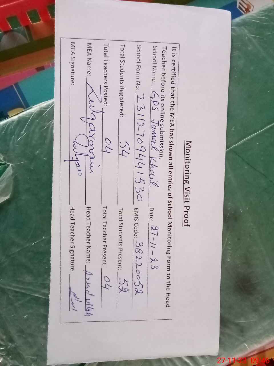 | Attendance Register | Head Teacher | MEA with School | Visit Proof |