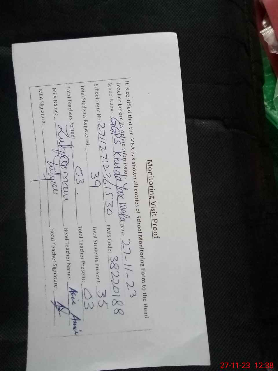 | EMIS Code: 38220188 | Name of School: GGPS KHUDA YAR WALA | |||