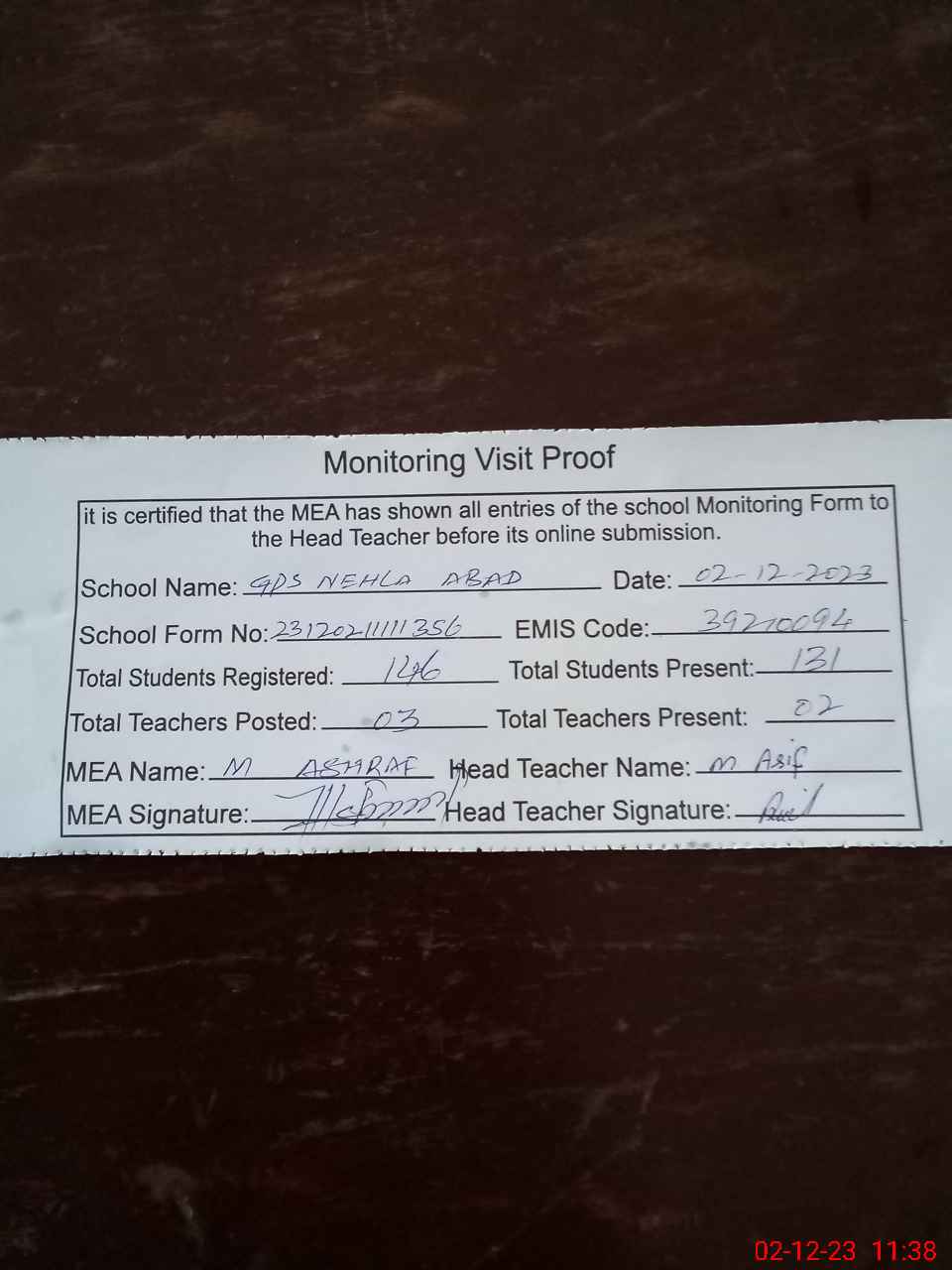| Attendance Register | Head Teacher | MEA with School | Visit Proof |