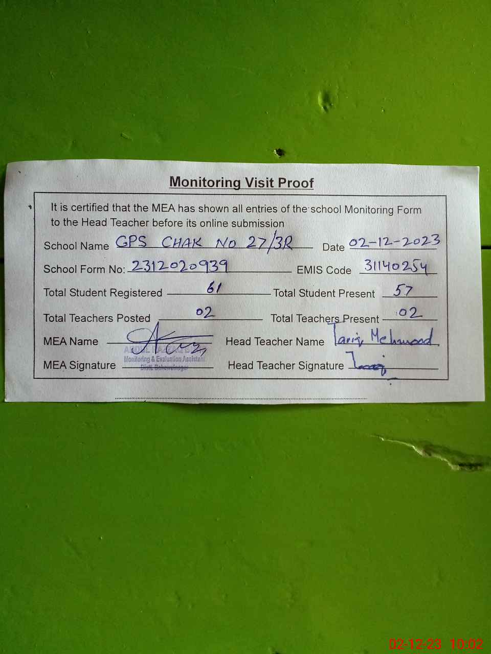 | Attendance Register | Head Teacher | MEA with School | Visit Proof |