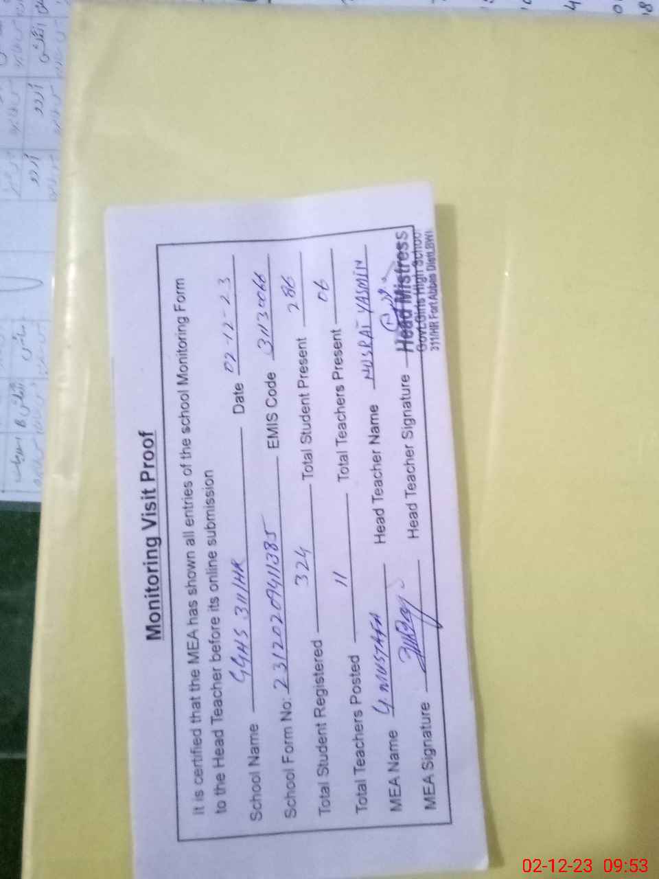 | Attendance Register | Head Teacher | MEA with School | Visit Proof |