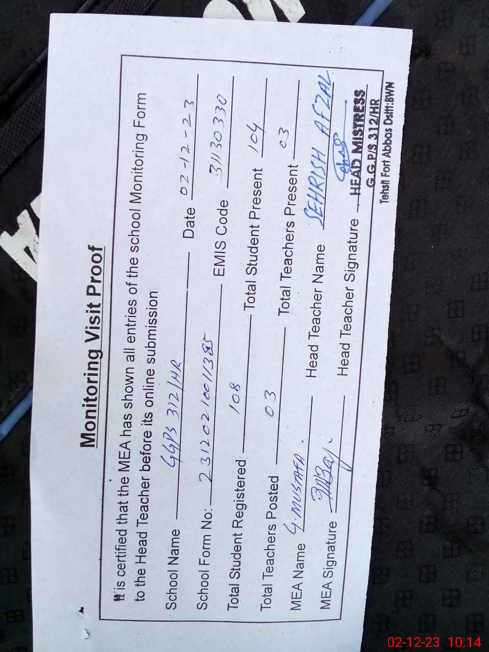 | EMIS Code: 31130330 | Name of School: GGPS CHAK NO. 312 HR | |||