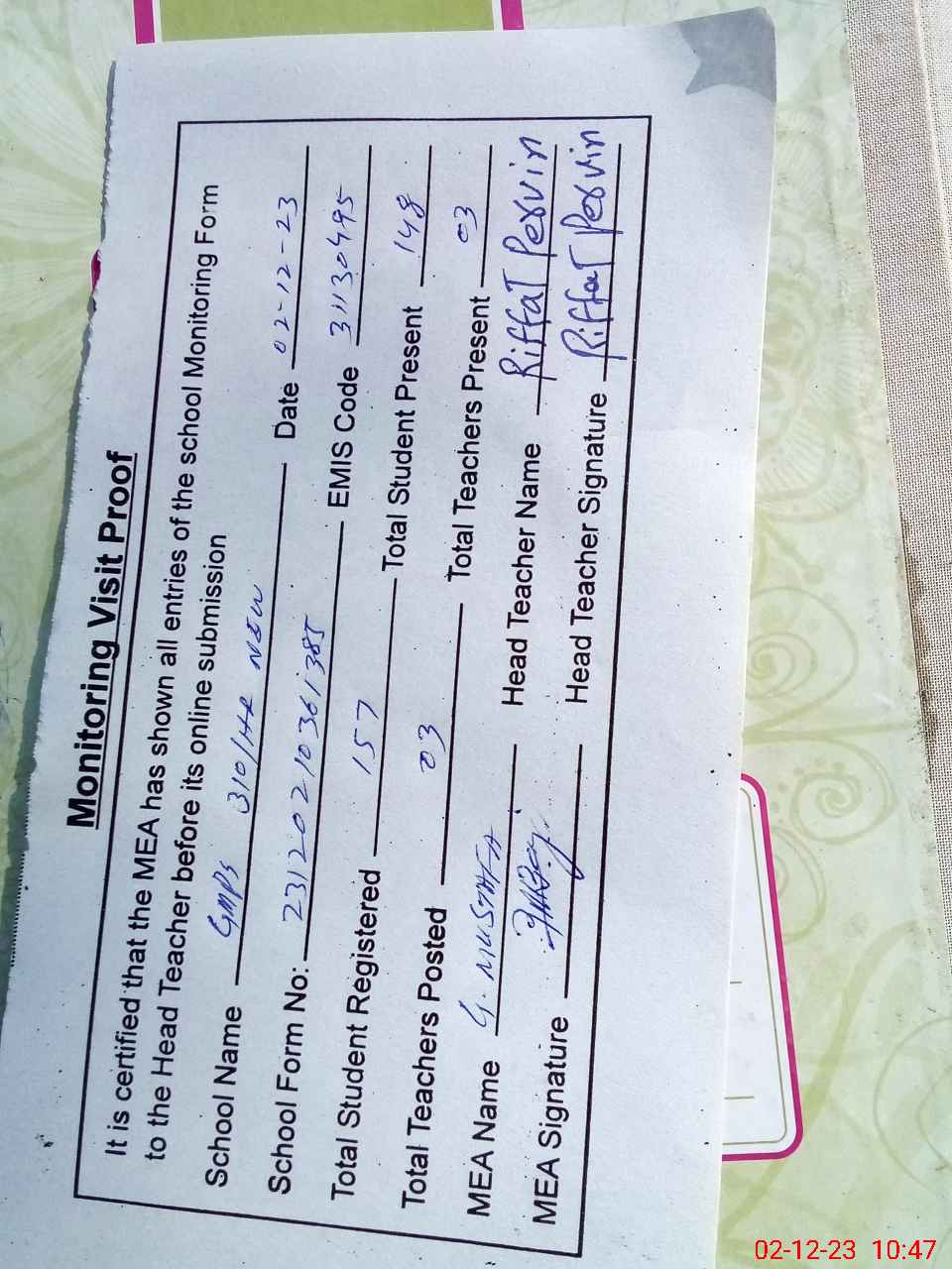| Attendance Register | Head Teacher | MEA with School | Visit Proof |