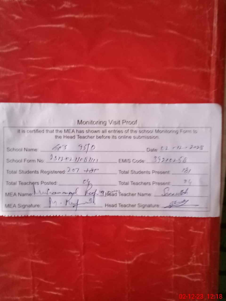 | Attendance Register | Head Teacher | MEA with School | Visit Proof |