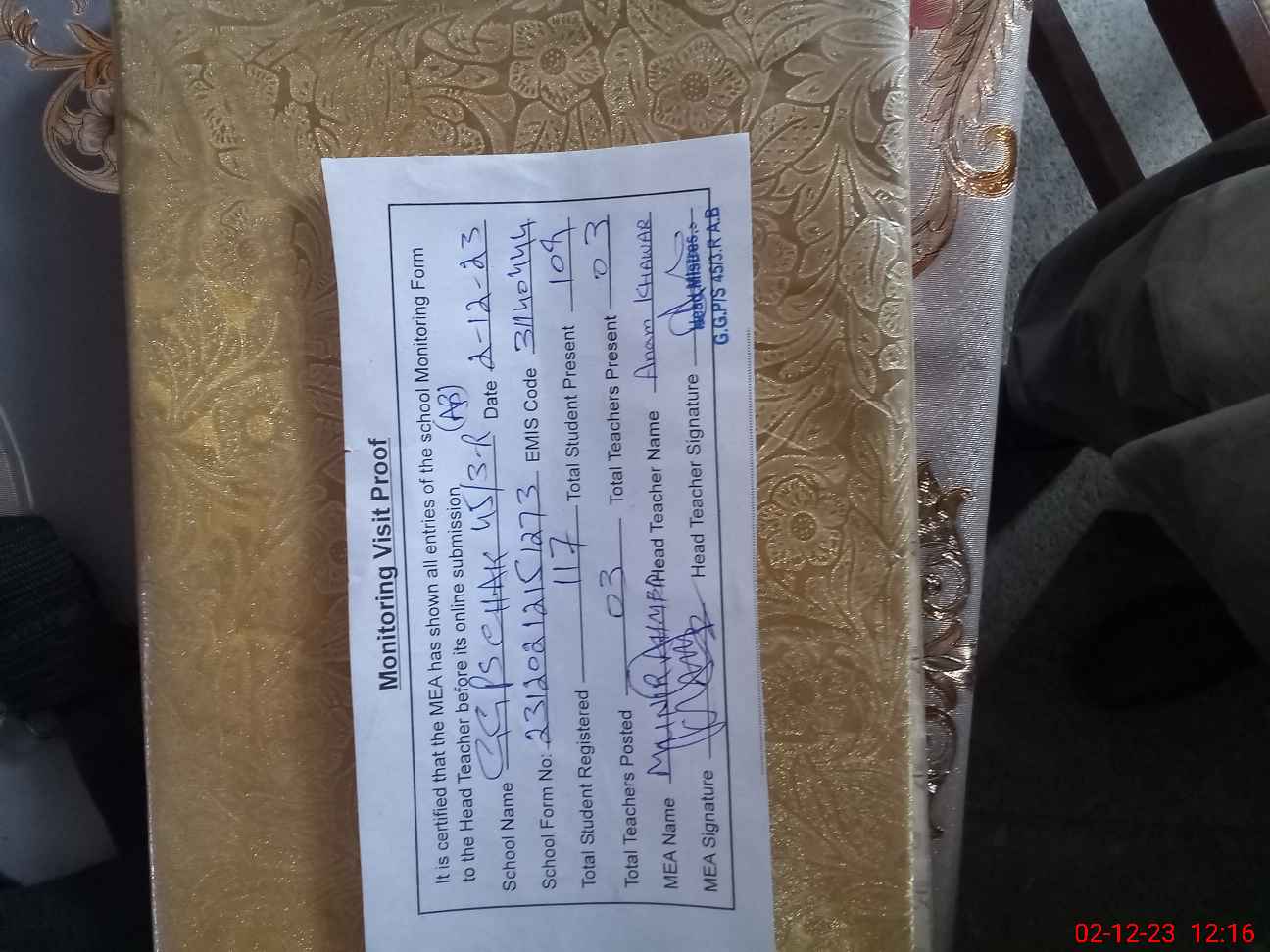 | Attendance Register | Head Teacher | MEA with School | Visit Proof |