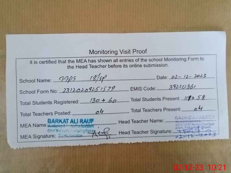 | EMIS Code: 39210361 | Name of School: GGPS CHAK 18 SP | |||