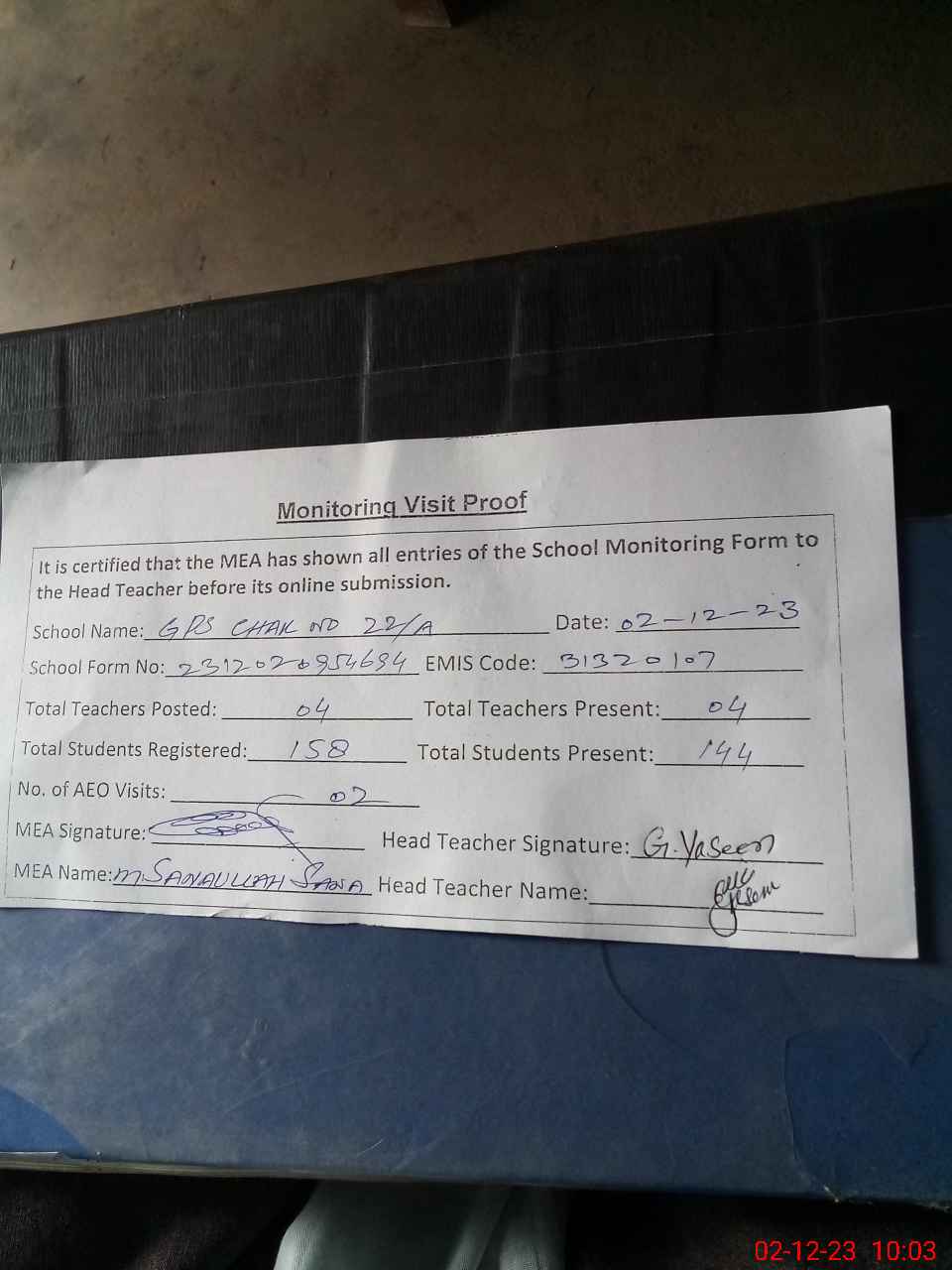 | Attendance Register | Head Teacher | MEA with School | Visit Proof |