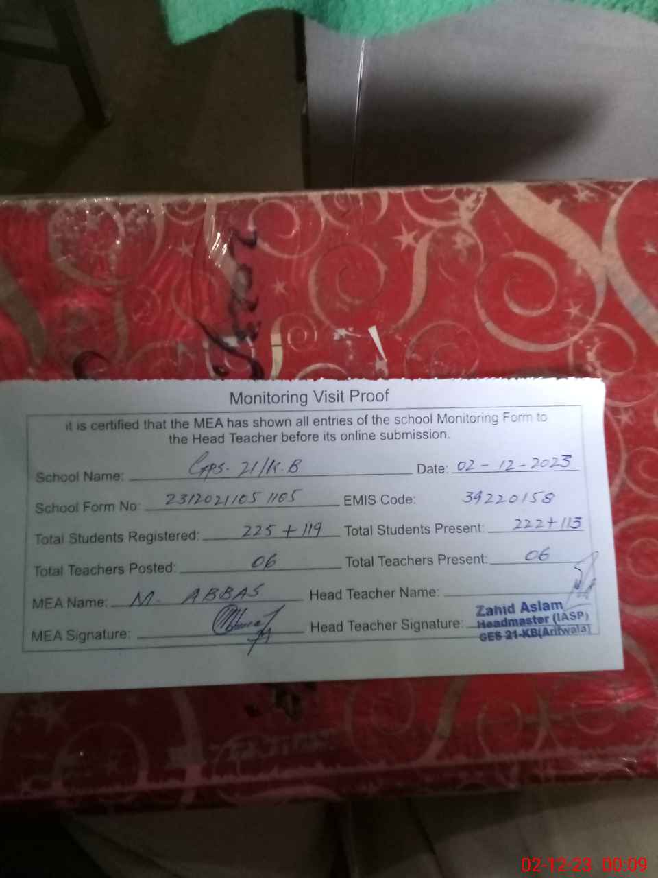 | EMIS Code: 39220158 | Name of School: GPS CHAK NO. 21 KB | |||