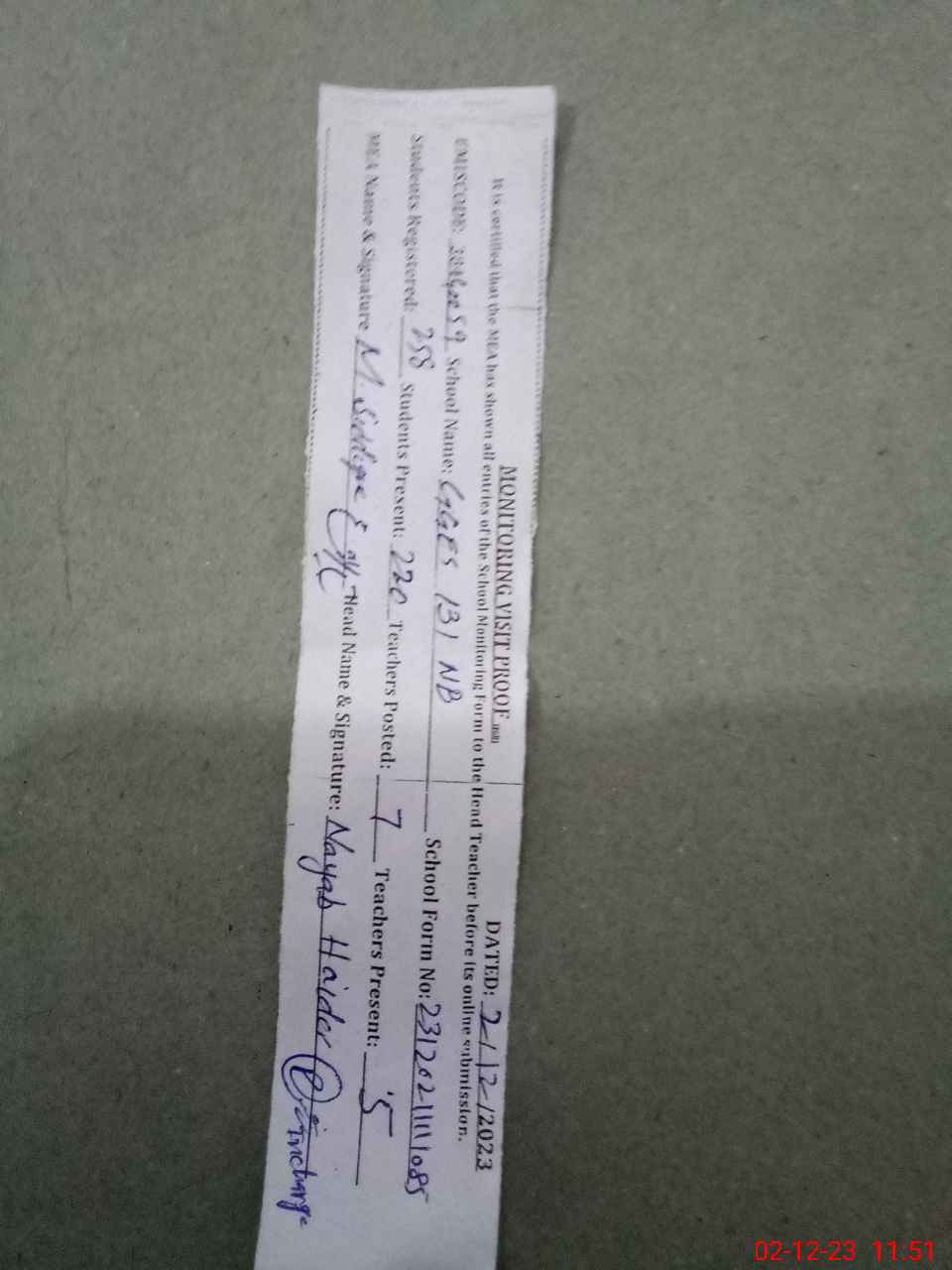 | Attendance Register | Head Teacher | MEA with School | Visit Proof |