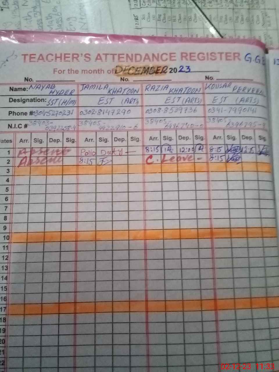 | CNIC | Full Name | Designation | R/C | Absence During Last Calender Month |