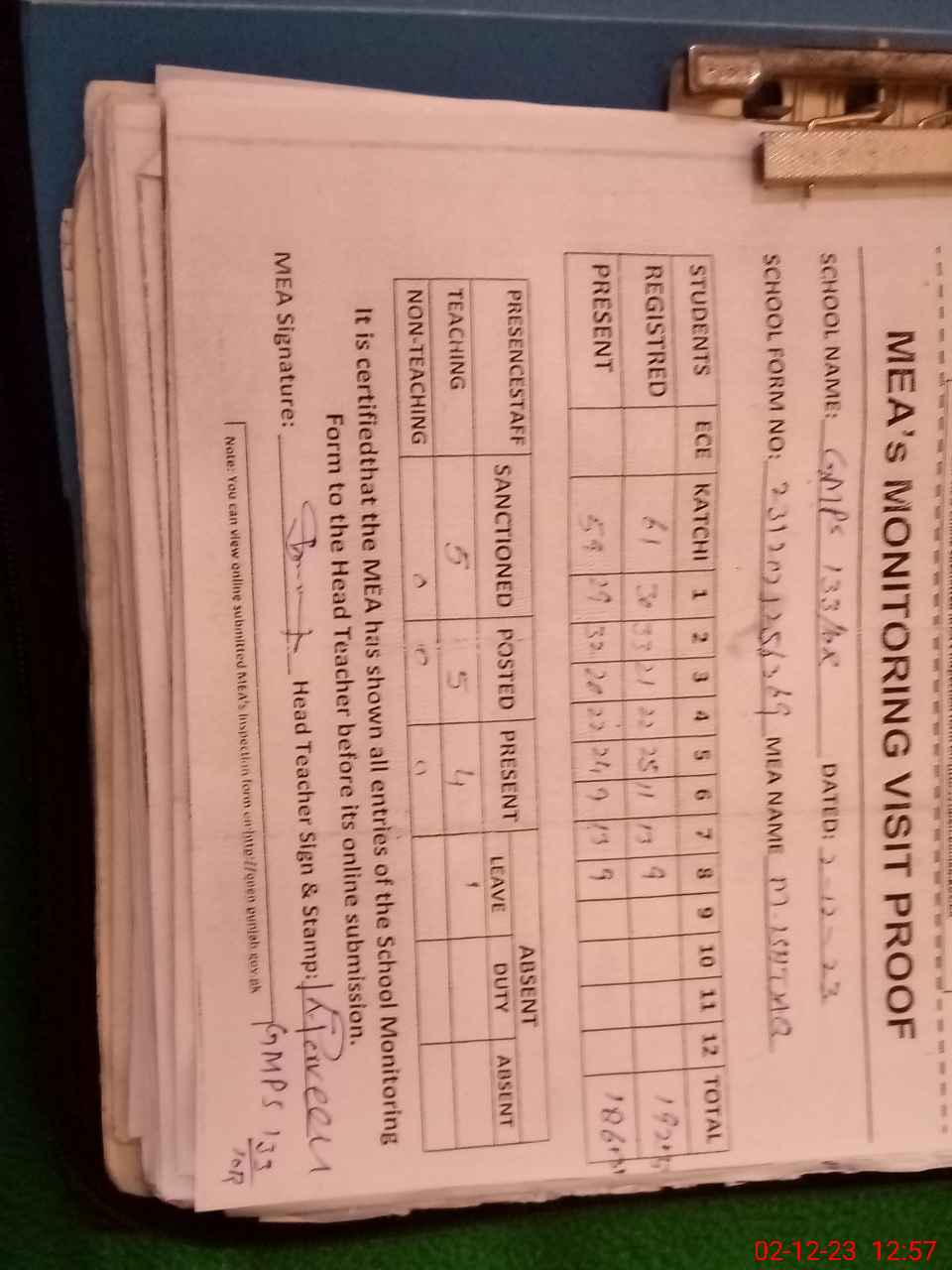 | Attendance Register | Head Teacher | MEA with School | Visit Proof |