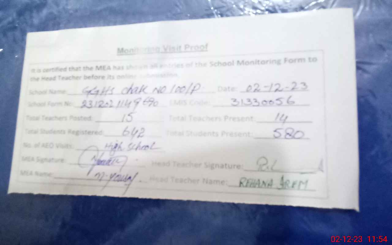 | EMIS Code: 31330056 | Name of School: GGHS CHAK NO. 100/P | |||