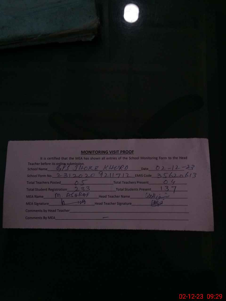 | EMIS Code: 35620613 | Name of School: GPS JHOK KHURD CHAK NO. 14/RB | |||