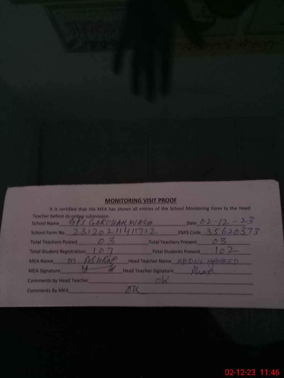 | Attendance Register | Head Teacher | MEA with School | Visit Proof |