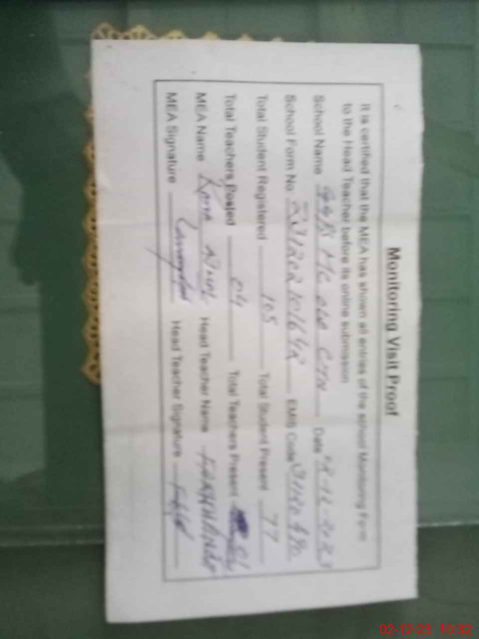 | Attendance Register | Head Teacher | MEA with School | Visit Proof |
