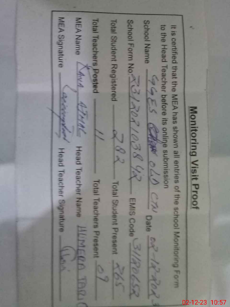 | Attendance Register | Head Teacher | MEA with School | Visit Proof |