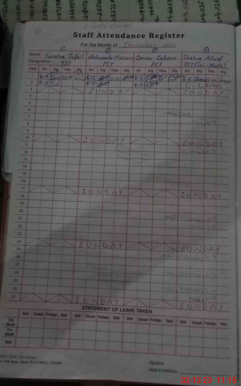 | CNIC | Full Name | Designation | R/C | Absence During Last Calender Month |