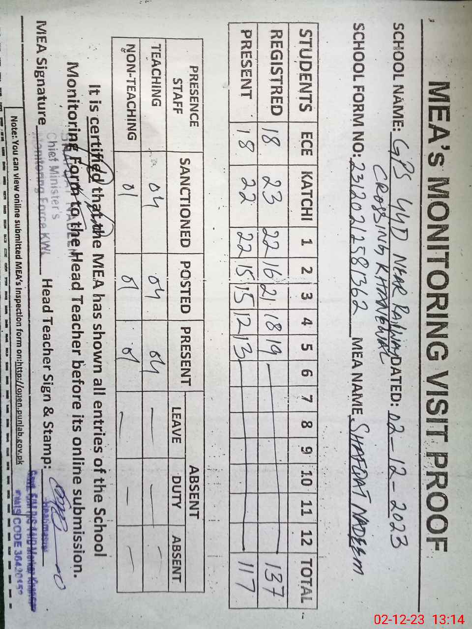 | Attendance Register | Head Teacher | MEA with School | Visit Proof |