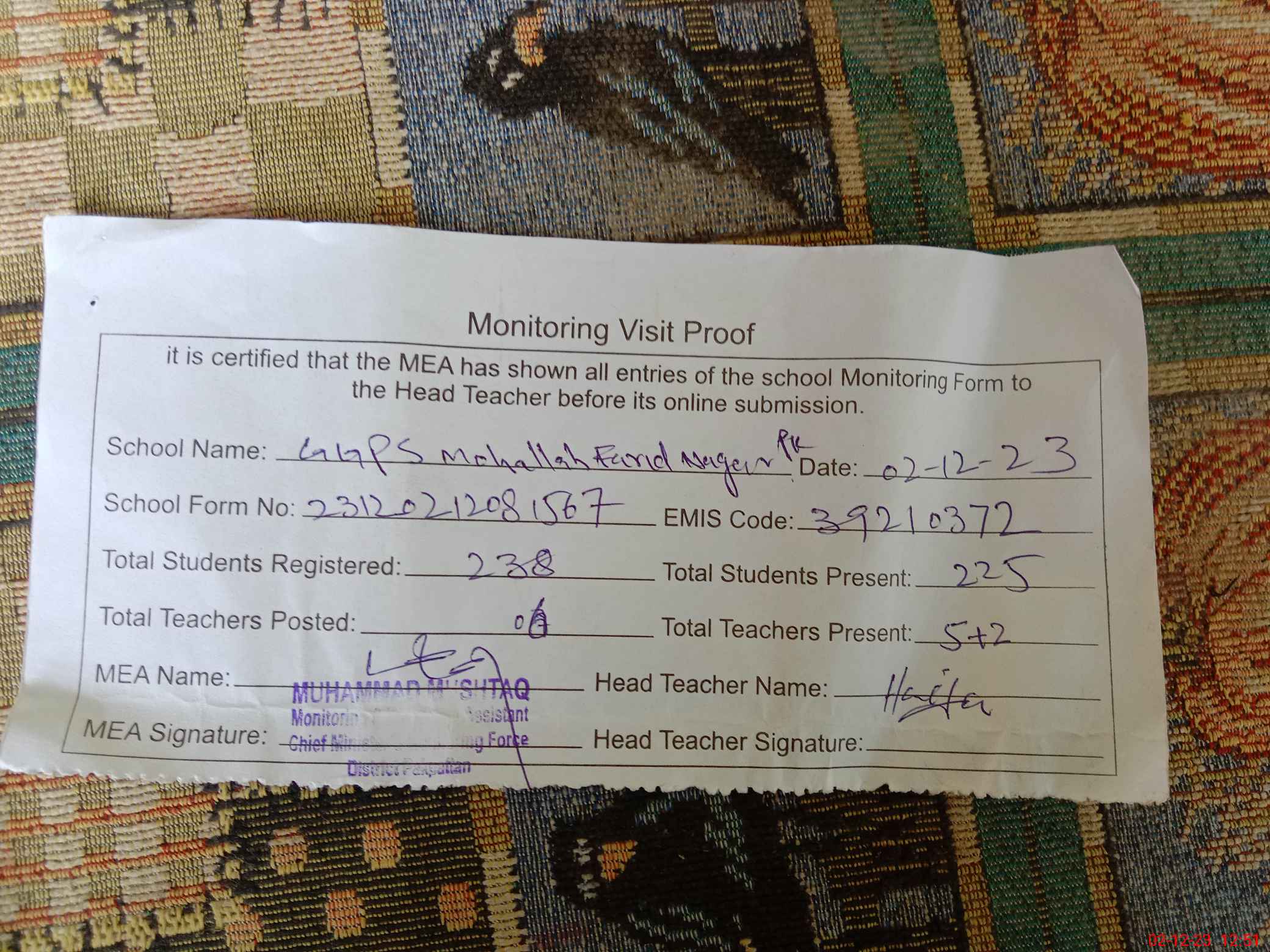 | Attendance Register | Head Teacher | MEA with School | Visit Proof |