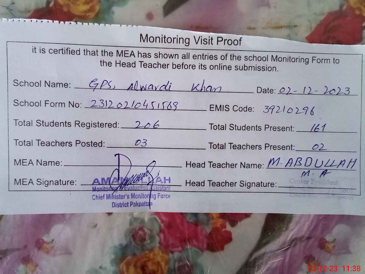 | EMIS Code: 39210291 | Name of School: GPS ALWARDI KHAN | |||