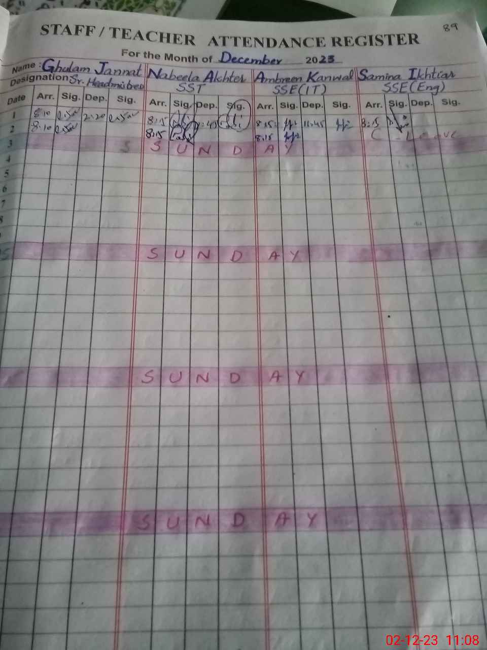 | CNIC | Full Name | Designation | R/C | Absence During Last Calender Month |