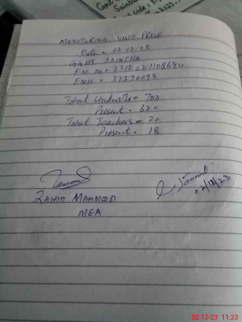 | Attendance Register | Head Teacher | MEA with School | Visit Proof |