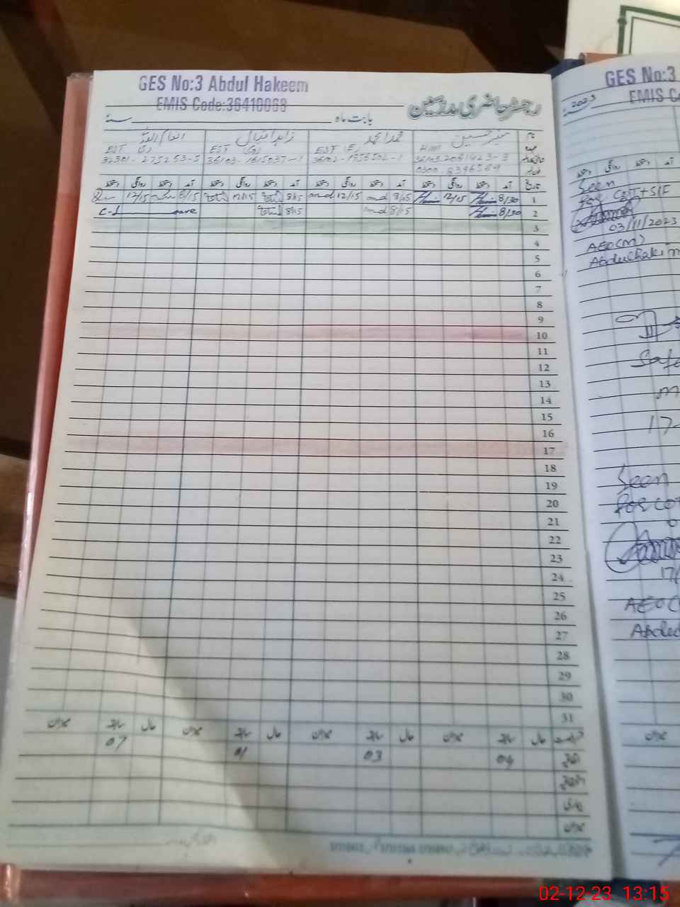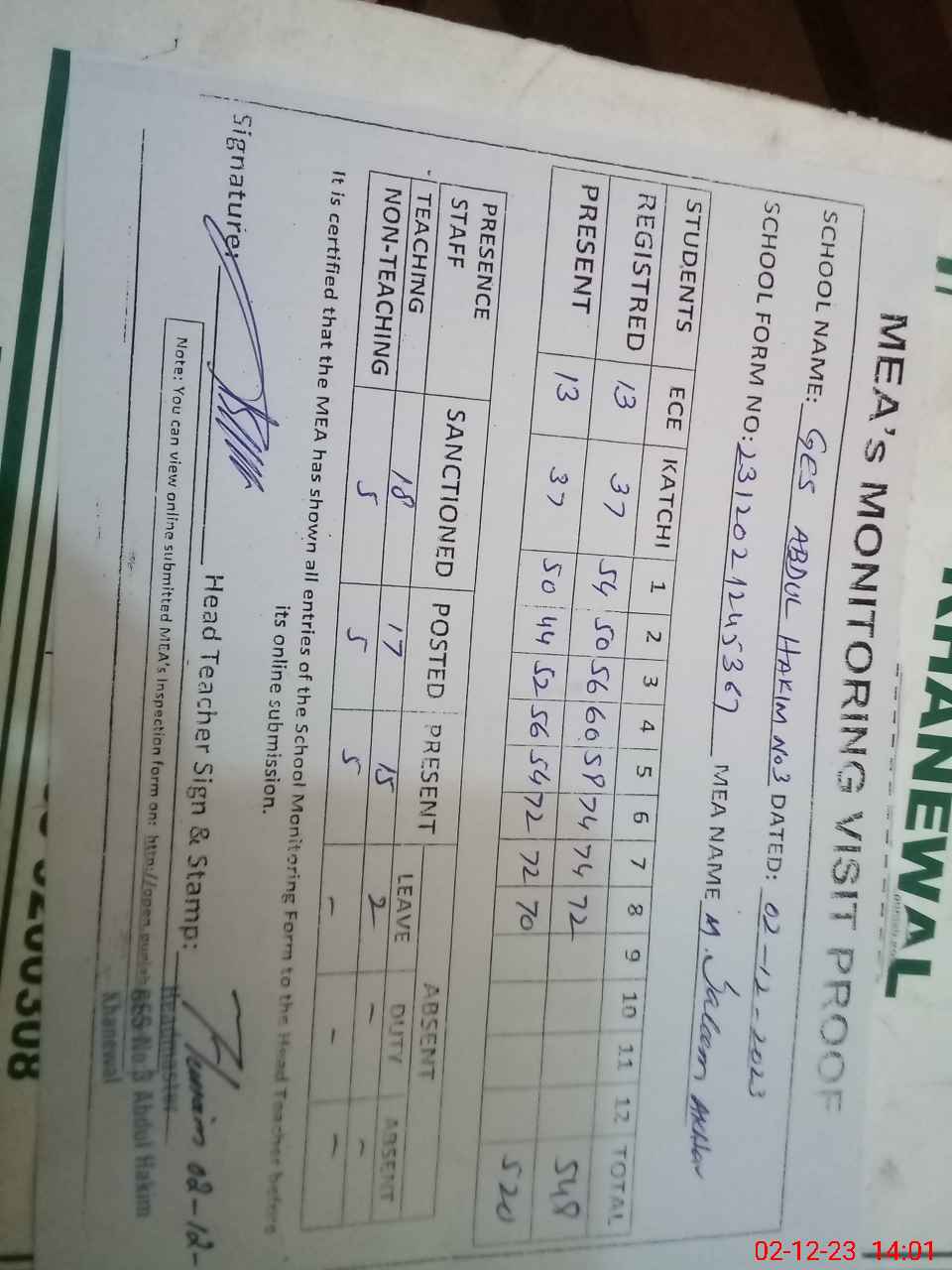 | Attendance Register | Head Teacher | MEA with School | Visit Proof |