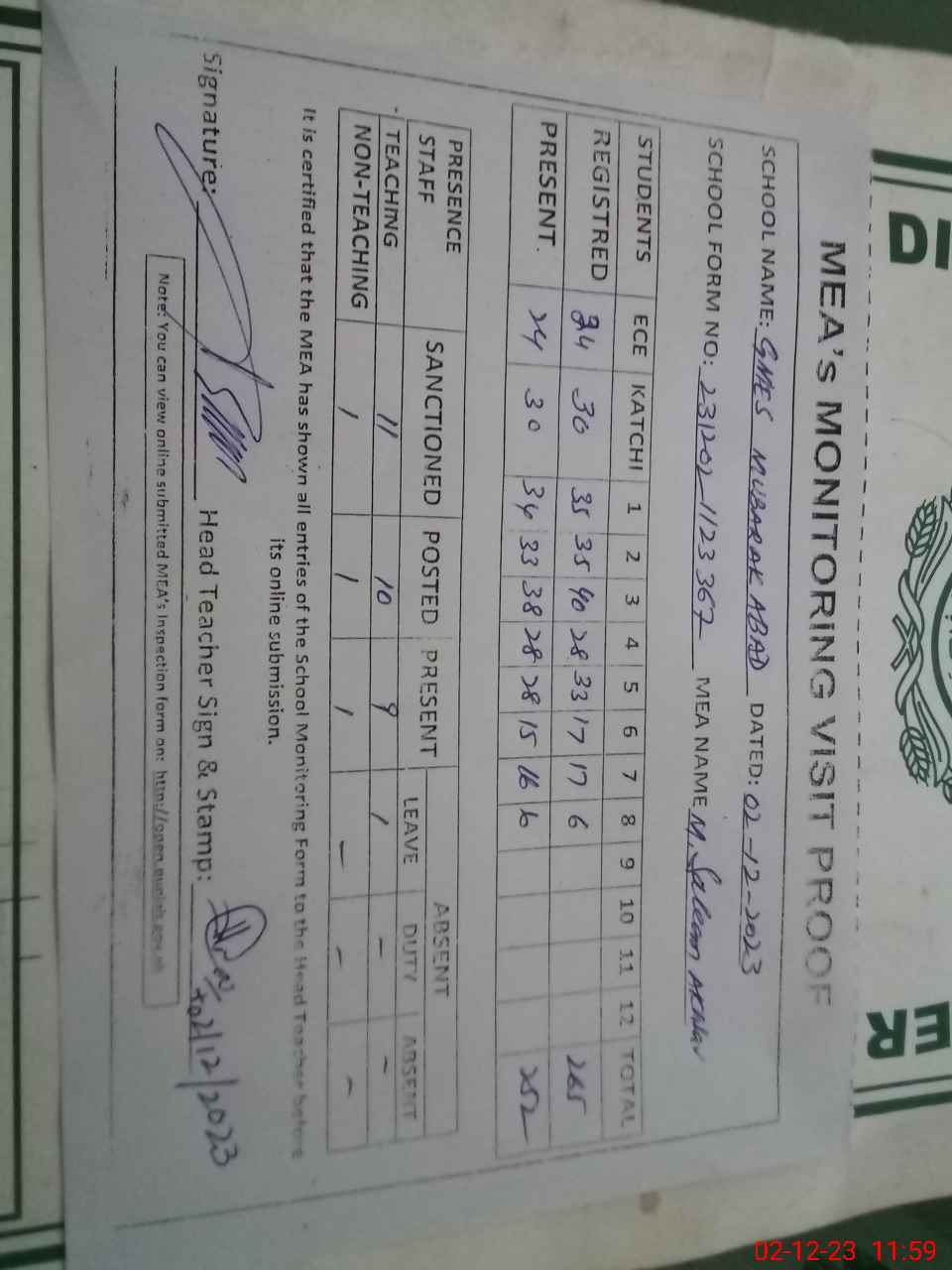 | Certified that this School was Inspected by the Undersigned MEA/DMO Today and the Information Stated Above is as Per Record. | |||||