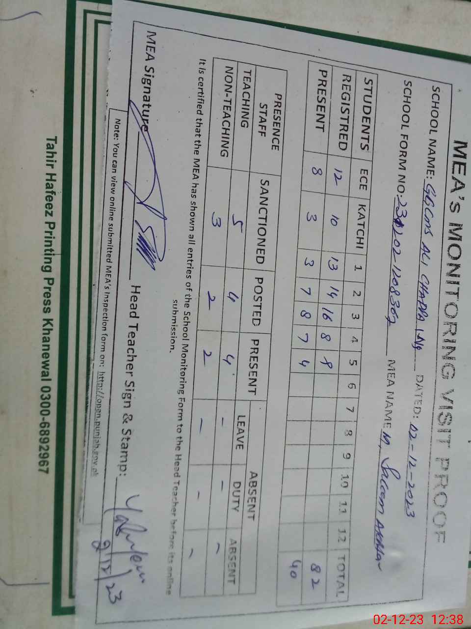 | Attendance Register | Head Teacher | MEA with School | Visit Proof |
