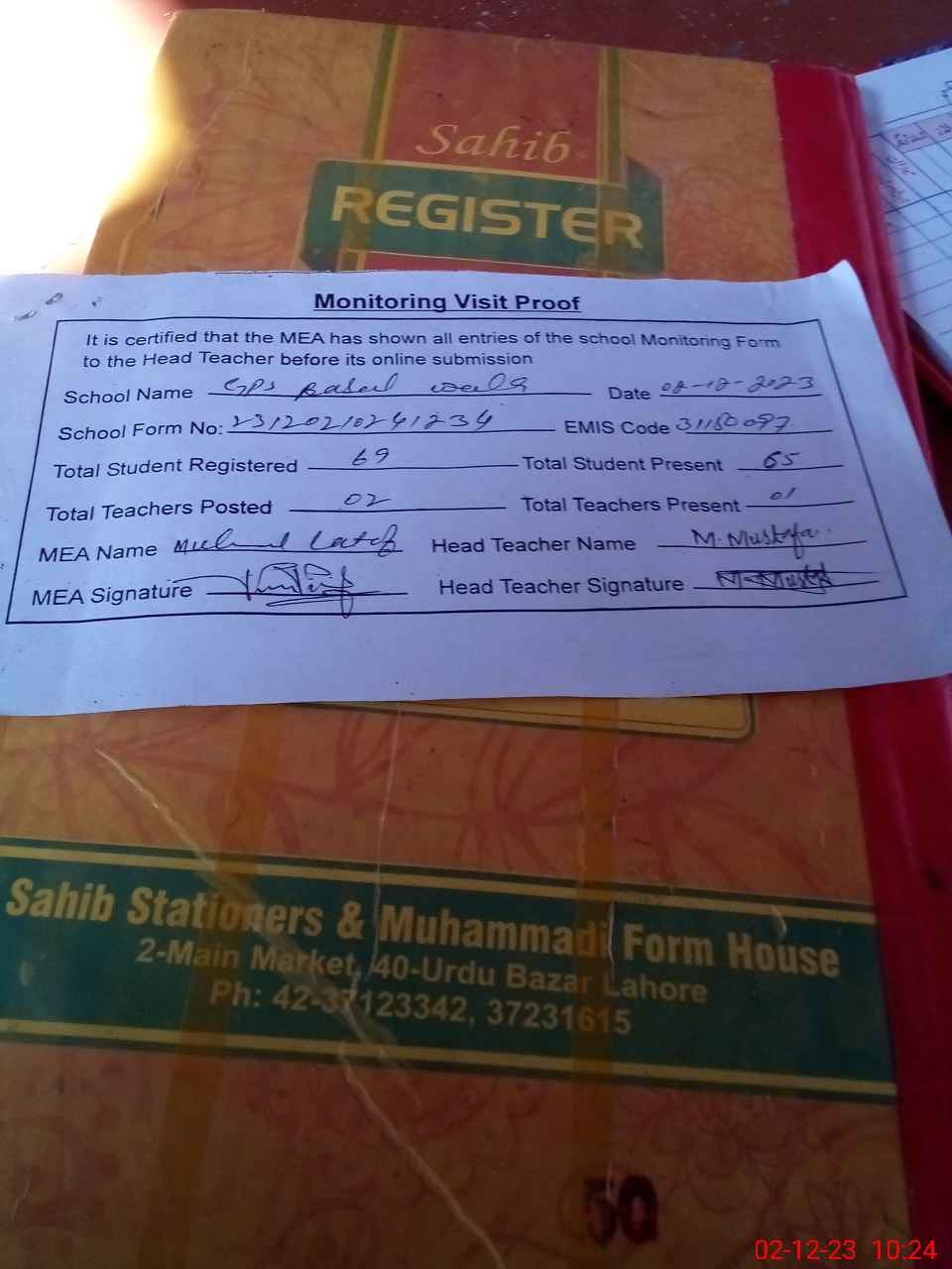 | Attendance Register | Head Teacher | MEA with School | Visit Proof |