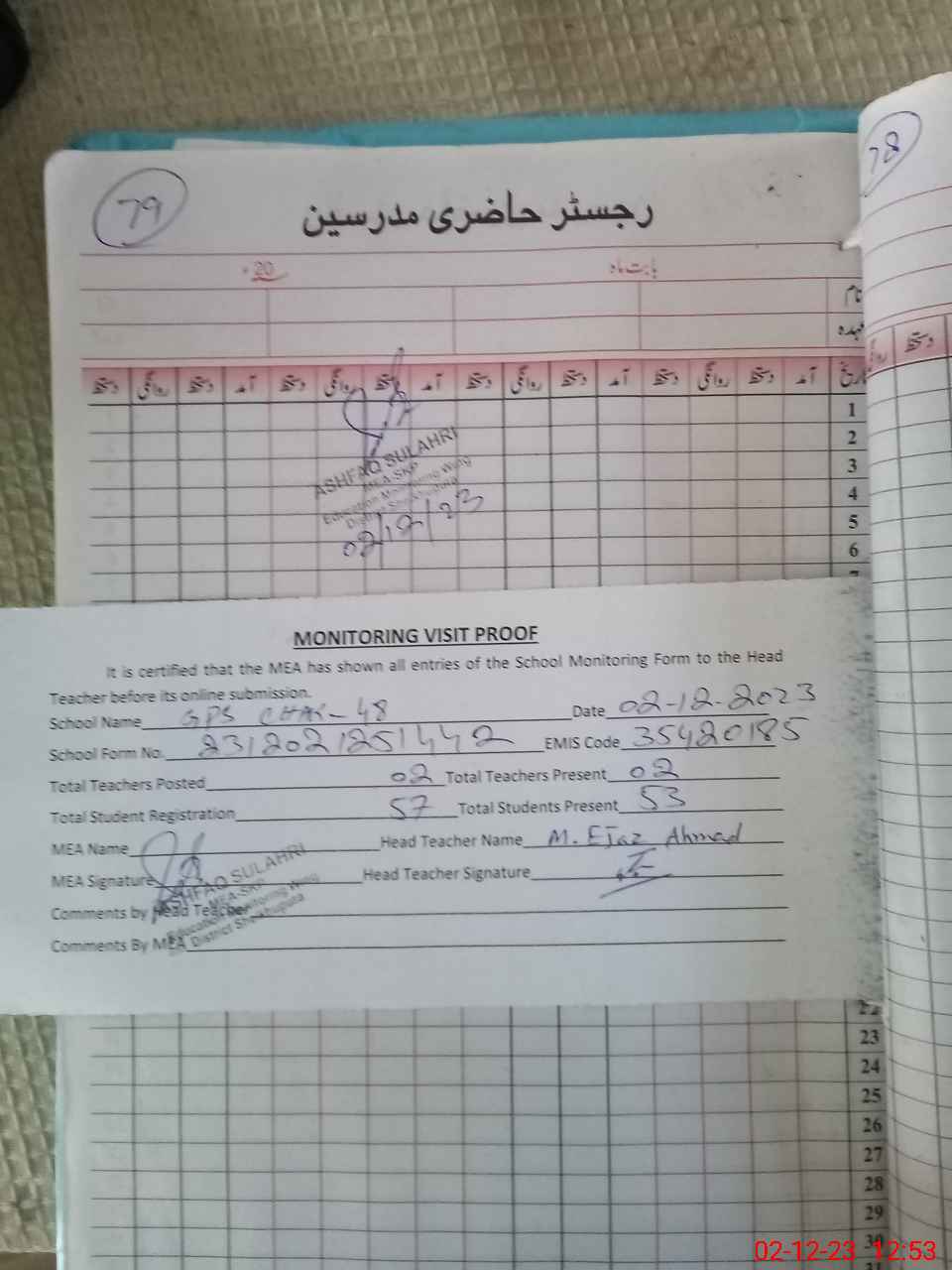 | Attendance Register | Head Teacher | MEA with School | Visit Proof |