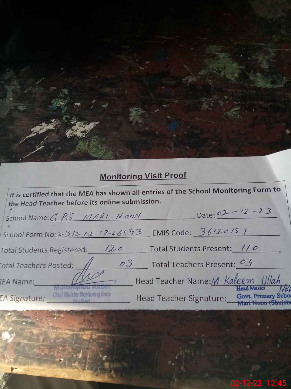 | EMIS Code: 36120151 | Name of School: GPS MARI NOON TAIL FAIZ PUR | |||