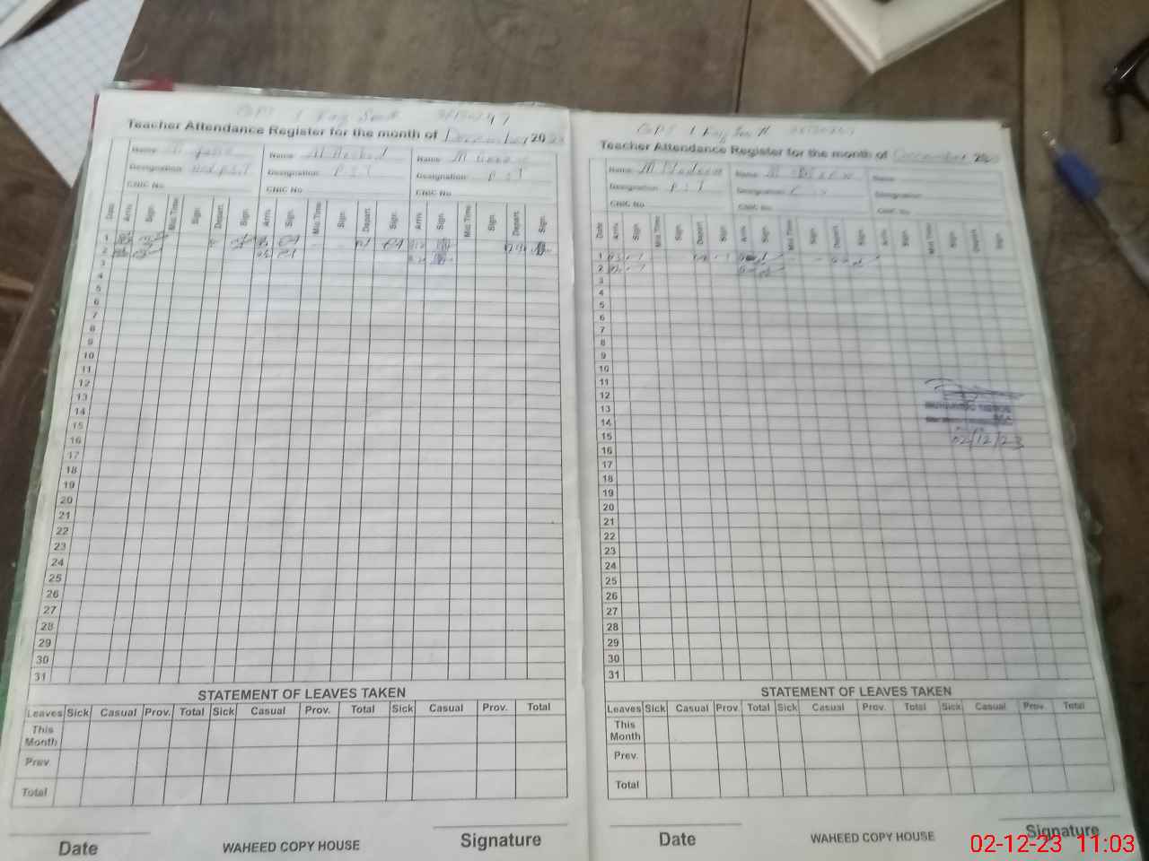 | CNIC | Full Name | Designation | R/C | Absence During Last Calender Month |