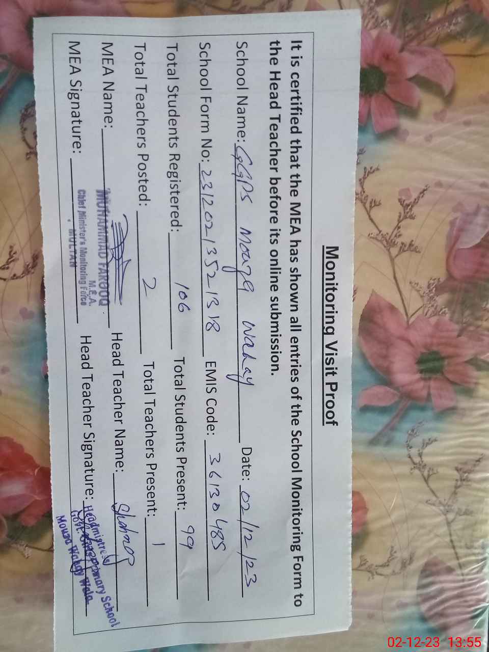 | Attendance Register | Head Teacher | MEA with School | Visit Proof |