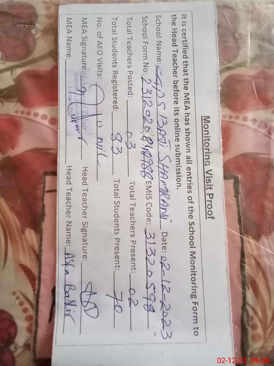 | Certified that this School was Inspected by the Undersigned MEA/DMO Today and the Information Stated Above is as Per Record. | |||||