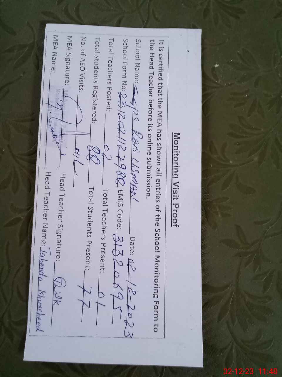 | Attendance Register | Head Teacher | MEA with School | Visit Proof |