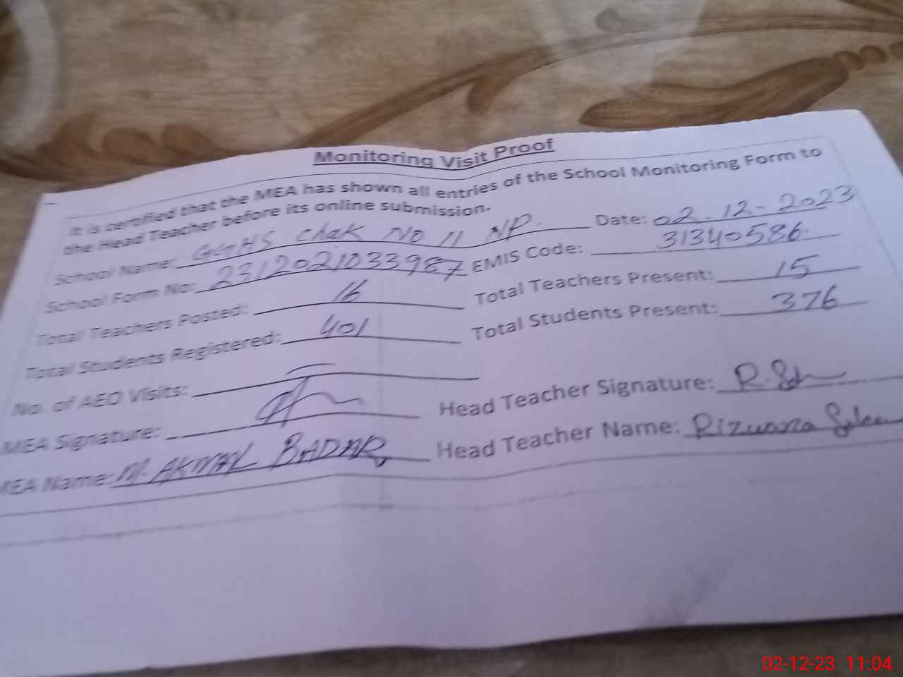| Attendance Register | Head Teacher | MEA with School | Visit Proof |