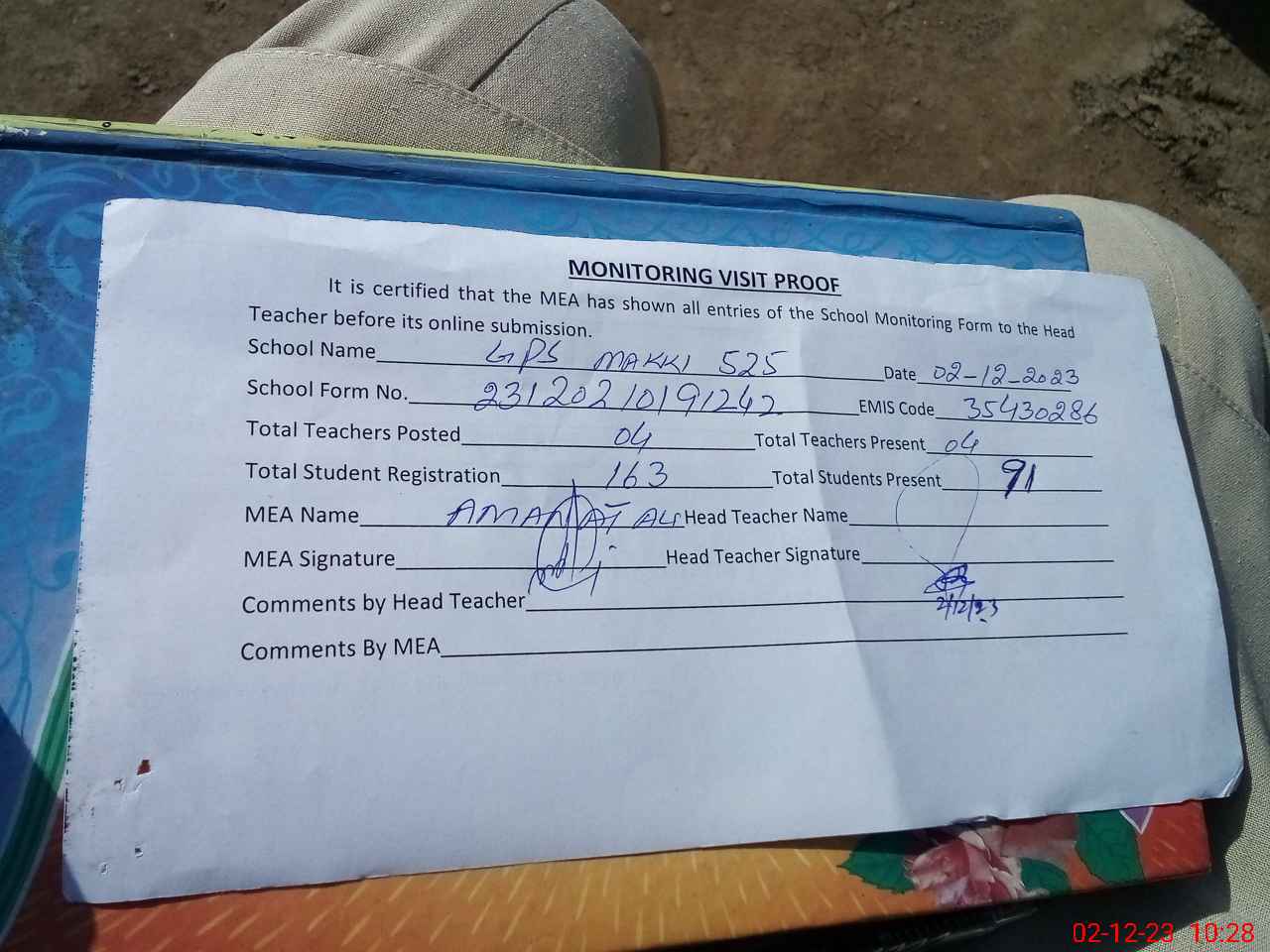 | Attendance Register | Head Teacher | MEA with School | Visit Proof |