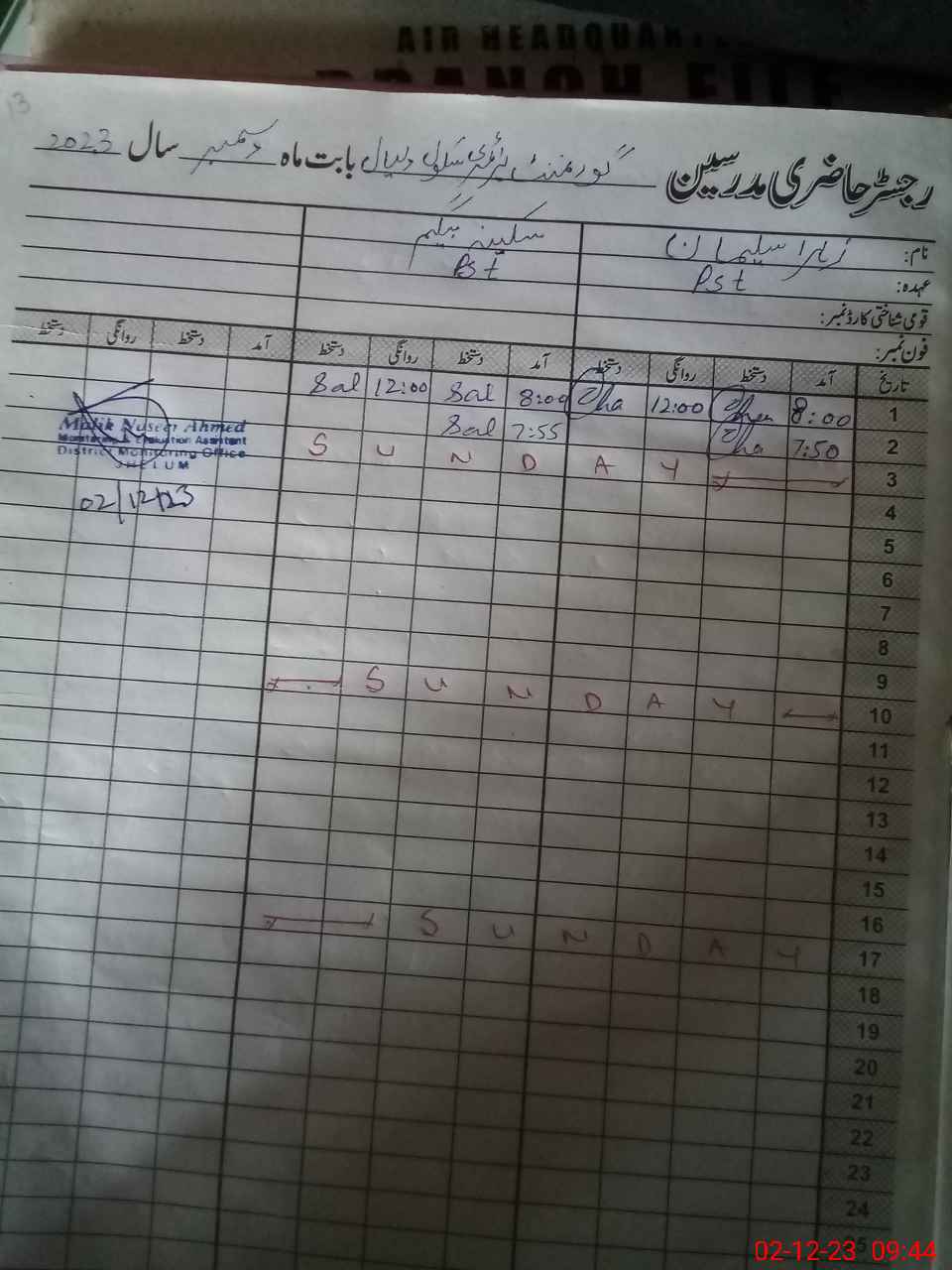 | CNIC | Full Name | Designation | R/C | Absence During Last Calender Month |