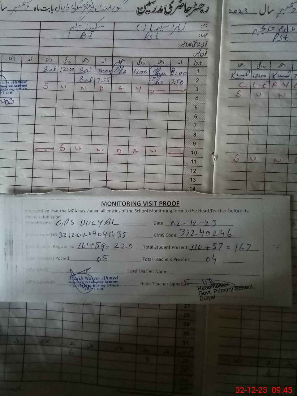 | Attendance Register | Head Teacher | MEA with School | Visit Proof |