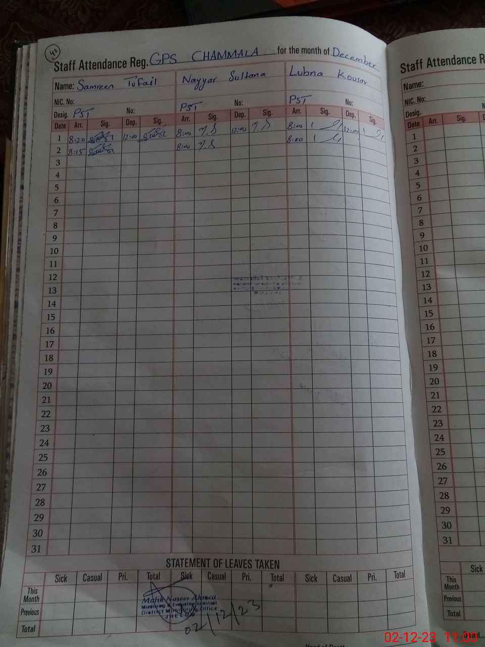 | CNIC | Full Name | Designation | R/C | Absence During Last Calender Month |