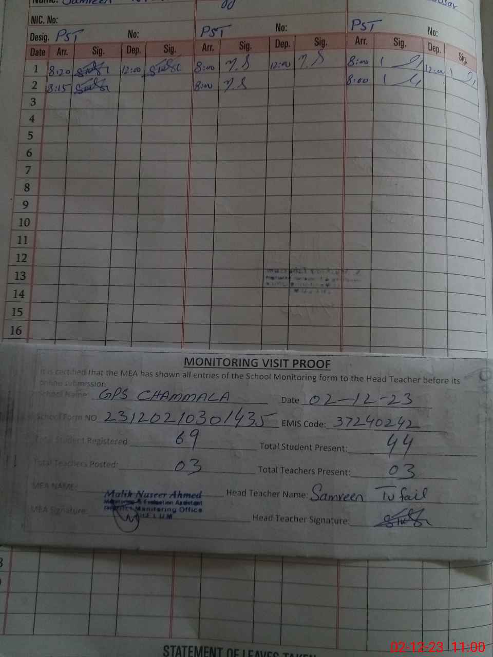 | Attendance Register | Head Teacher | MEA with School | Visit Proof |