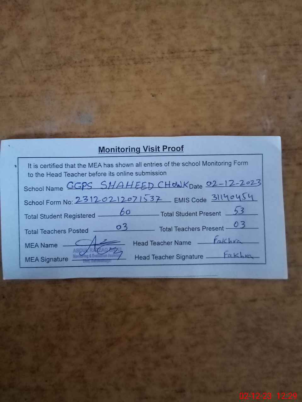 | Attendance Register | Head Teacher | MEA with School | Visit Proof |